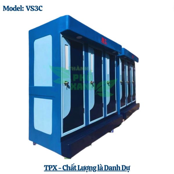 - Tiện nghi đầy đủ: Trang bị bệ xí sứ, vòi nước, lavabo, gương soi, quạt thông gió, đèn chiếu sáng, khóa cửa hiển thị trạng thái (xanh: trống, đỏ: đang sử dụng), và hệ thống xử lý chất thải tự hoại.